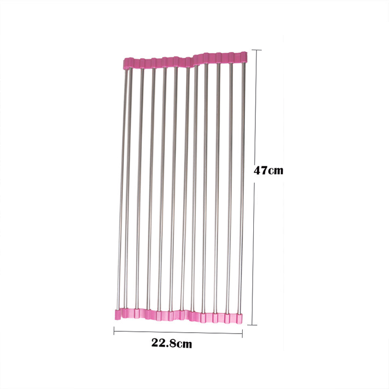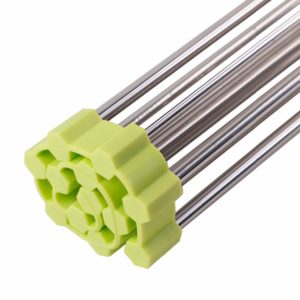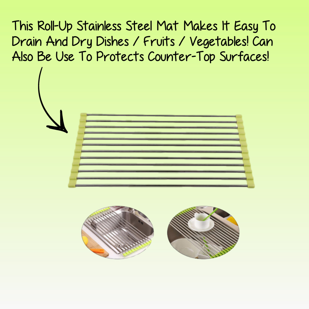 The Roll-Up Multi-Function Dish Rack is a multi functional disk rack that is can be use over the sink for drying dishes, cups, plates, bowls, tableware, cookware and utensils. It can also be used as a trivet under hot pots & pans, a cooling race for baked goods, a fruit and vegetable washing colander platform or for defrosting frozen food. The rack rolls out to any length to accommodate variations in counter tops and sinks.